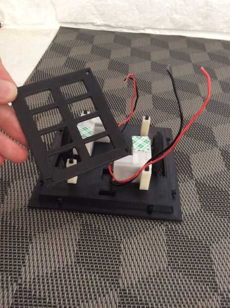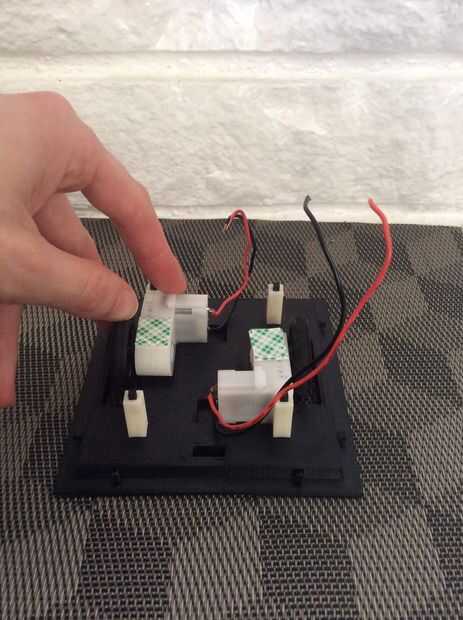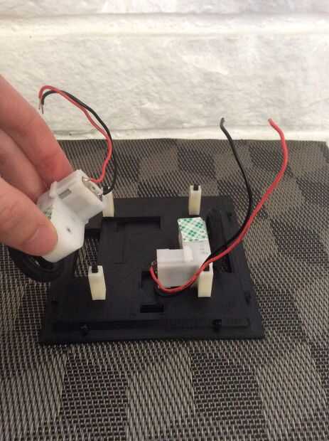 • Punta opcional: puede que no necesite hacer esto, pero hemos añadido unas pocas capas de cinta de doble cara gruesa a los lados superiores de los motores de la C.C. (ver fotos... es los cuadrados blancos y verdes en los motores). Esto actúa como un espaciador y los motores resto firmemente al ras contra la plataforma de plástico instalada por encima de ellos - bloqueo en su lugar y asegurando que cuando el bot descansando en el suelo las ruedas no ser empujado hacia arriba en el recinto, que puede causar que las ruedas pierden tracción y evitar que el robot se mueva normalmente.