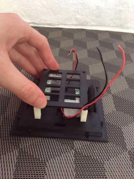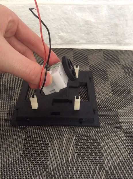 • Cuando está montado, las partes inferiores de las ruedas deben sobresalir ligeramente hacia fuera de las aberturas en la pieza base por aproximadamente 1/8" cuando se coloca en el suelo. Esto hará que la cara inferior de la pieza base para siempre estar a un ángulo leve y no totalmente al ras con el suelo. Esto es lo que queremos para conseguir tracción de las ruedas y mover el robot.