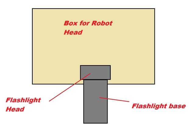 En el centro de la parte inferior de la caja de cartón que será la cabeza del Robot, rastrear la base de la linterna.  Cortar con unas tijeras o un cuchillo del Exacto este círculo.  La linterna debe tener una cabeza más grande que la base.  Si la linterna no es cónico, que tenga que envolver cinta alrededor de la cabeza de la linterna por lo que es más grande que el agujero.  La linterna debe sentarse en el agujero sin caer hacia fuera, solamente la manija de la linterna que sobresale a través del orificio.