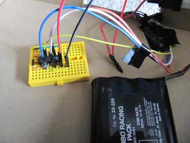 Coloque la batería motor en la caja y conectarlo a la placa. Tenga en cuenta que el motor de batería + extremo va al pin abajo a la derecha del chip, y el - extremo (tierra) está conectado a uno de los lugares de la tierra en el protoboard.