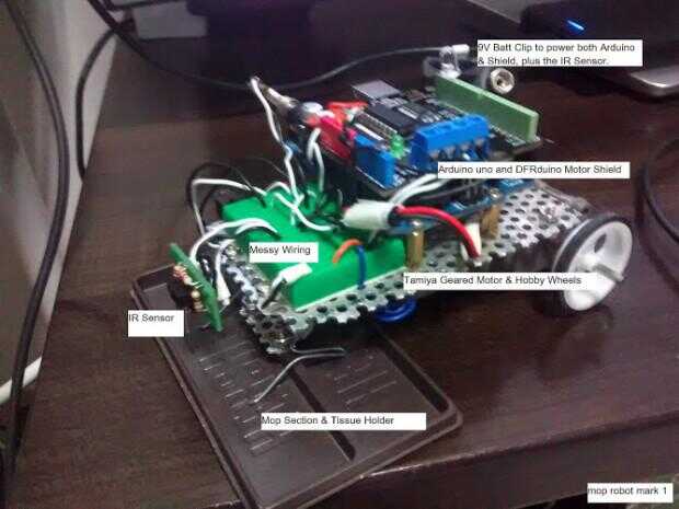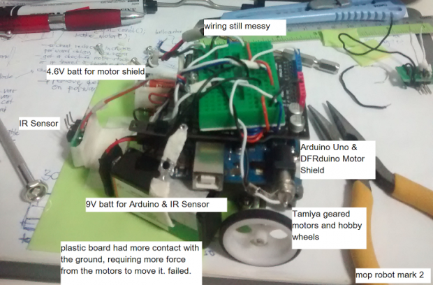 el diseño original era un poco de un cableado voluminoso, pero funcionó bien, sólo en una batería de 9V solo para alimentar el arduino uno, escudo del motor y un sensor de infrarrojos. Luego leí algunos posts que esto era una mala idea por lo que tuve que dividir poderes para el arduino y el escudo del motor y la sección de fregona consiguió también dio para arriba después de golpear varias veces a altas velocidades.