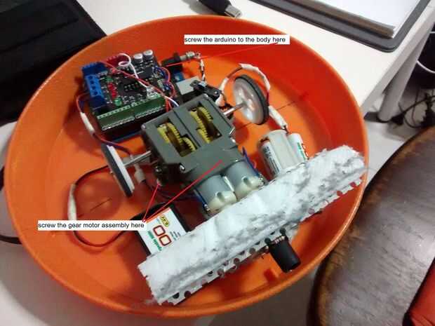 Esto tendrá que tener, como máximo, 3 secciones que va a tocar el suelo. lo que hice fue tener todos los componentes atornillados en la parte inferior del cuerpo principal, por lo que se va colgando hacia abajo. un típico robot con motores, generalmente habrá 3 porciones que va a tocar el suelo; 2 ruedas y un ballcaster. aquí, ya que es una fregona, el 3 º contacto con el suelo es un artilugio de fregona. su básicamente un pequeño trozo de tablero donde puede cortar un pedazo pequeño de tejido. mi primera versión utiliza un recipiente de chocolate plástico que luego se atornilla en la parte inferior de los artilugios. revisa este link;
