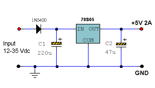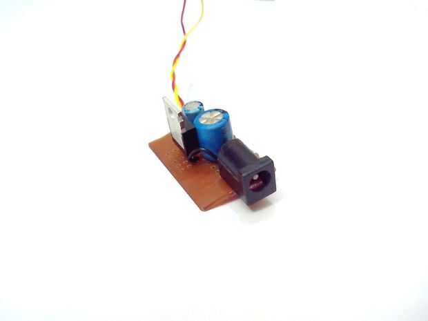 a diferencia de Arduino el PCDuino no tiene un tablero de regulador de voltaje por lo que necesita construir uno. El PCduino utiliza la fuente de 5v 2A. Que permite construir un regulador de voltaje a la energía en usted PCDuino. Seguir el circuito y es muy fácil construirlo, cortar el PCB para un requiere tamaño y soldar todo en él. Aproximadamente podría utilizar 9v a 15v como entrada para obtener salida de 5v.