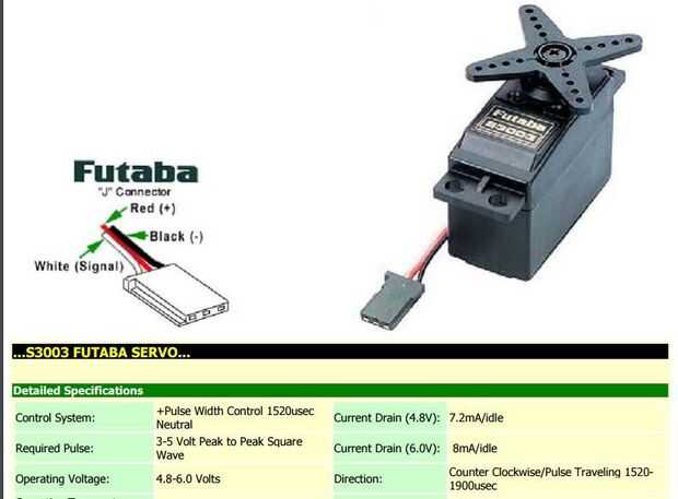 He utilizado Futuba s3003 servo - la conexión es muy simple el "+" & "-" va a la Junta del L298 como se indica anteriormente. Es importante mirar el voltaje de funcionamiento del servo (en mi caso su V 4.8-6 ver imagen de arriba), el cable de señal debe ser conectado a la salida GPIO, normalmente su blanco o naranja