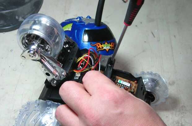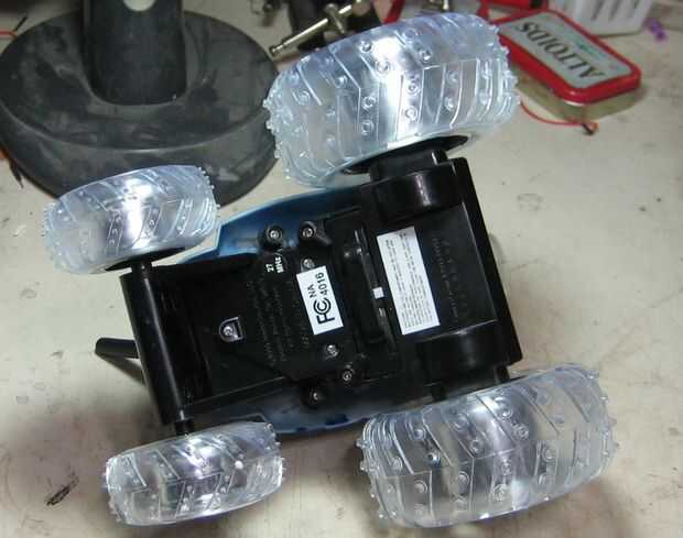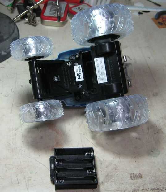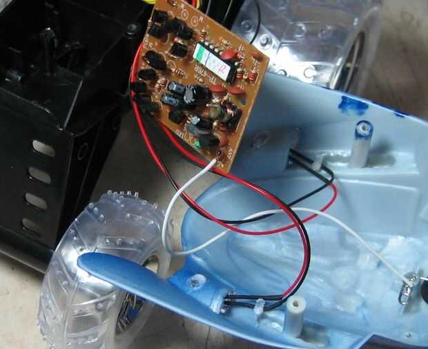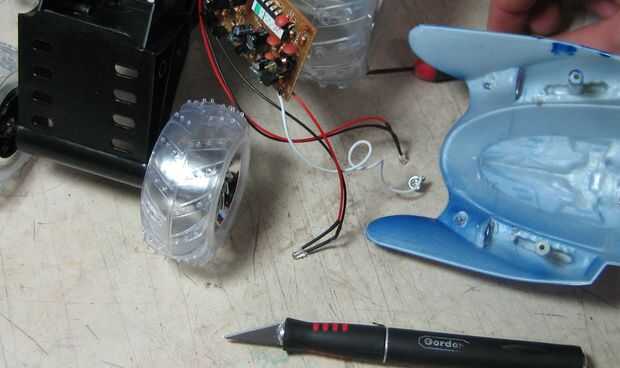 Una vez la cáscara puede ser quitada, despegar suavemente, todavía tiene algunos cables conectados. Ésos son la antena (no importante) y dos LED que enciende cuando se alimenta o rueda. He dejado los cables y LEDs conexión a mi vaso, pero usted puede simplemente cortar y después desoldar lo PCB para sacarlos del camino. Otro punto YMMV.