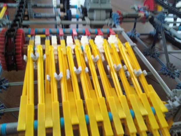 Programación Zeeanobot es simple. Usted acaba de poner barras de blanco en los conectores de 8 patas blanco. Esta manera, cuando usted enciende el motor, gira el eje, que se une a la armadura de programación por medio de una cadena. La barra blanca que se pone en la armadura luego empuja hacia arriba el dedo, que gira alrededor de un árbol en la mano, dejando la parte delantera del dedo para empujar hacia abajo en una de las teclas del piano. Entre la parte superior de los dedos soltando la tecla pasa a la barra de blanco. Si usted encuentra que la varilla del blanco no lo hacen a través de las dos barras amarillas, mover el Clip gris por parte de la armadura de programación.