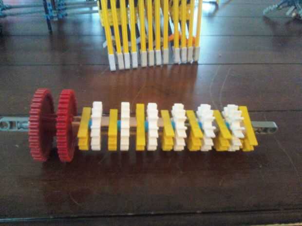 Gris 1-patas---Tan Clip (n-)---engranaje rojo medio---medio engranaje rojo---Tan Clip (-n) +++ amarilla de 5 puntas---separador azul---blanco 8 puntas---Clip Tan (-n)--- repetición de +++ 5 veces más ---amarillo 5 puntas---gris 1 diente