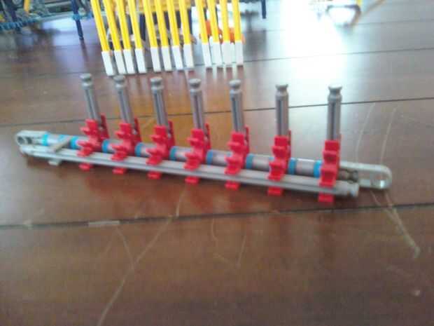 Clavijas 1 gris---azul espaciador---gris separador---separador azul---gris 1-clavijas (con rosca por el agujero) +++ azul espaciador---gris separador---separador azul---rojo 3 puntas--- repetición de +++ 6 veces más ---gris 1 diente