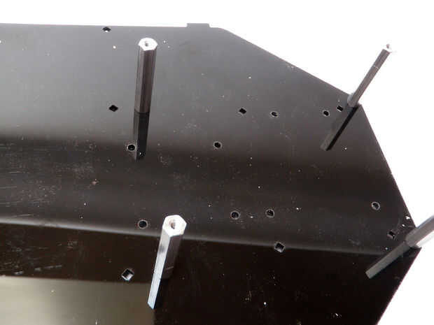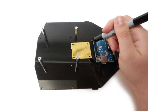 Lugar el Arduino y una media de dos mini placas de circuito impreso en el centro trasero del panel lexan inferior (la parte que se estrecha).