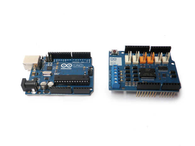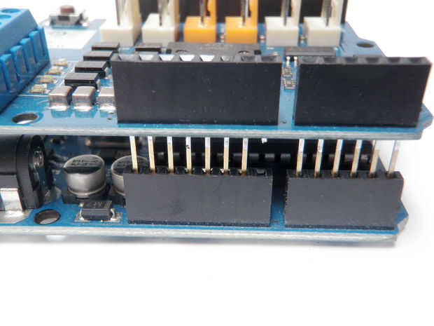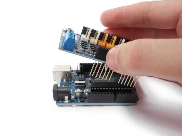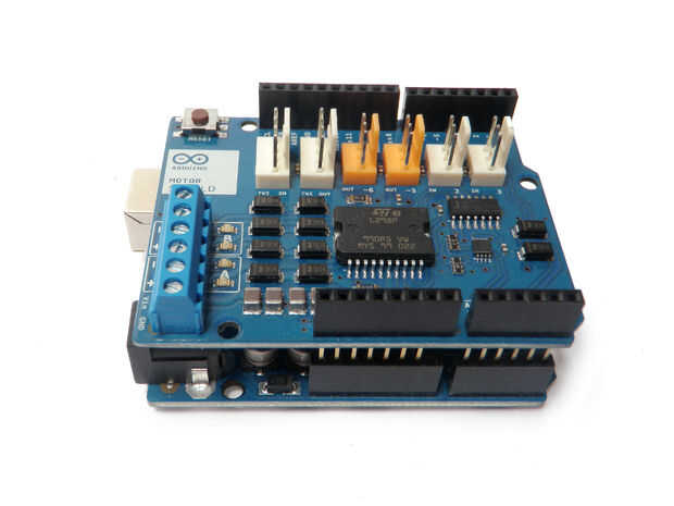 Inserte el protector de controlador de motor modificadas en el Arduino.