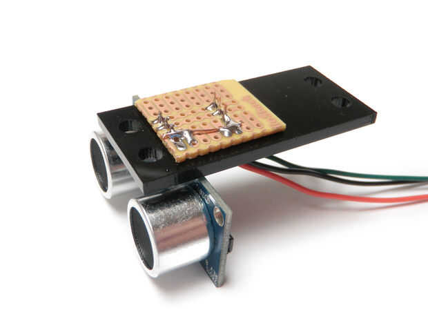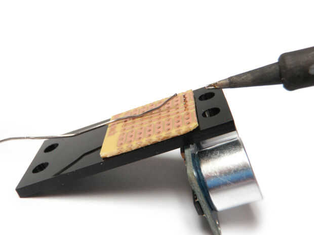 Respectivamente insertar 6" rojo, negro y verde los cables por los tres agujeros pequeños en el acrílico y adelante a través de agujeros en la PCB. Les de la soldadura en lugar así.