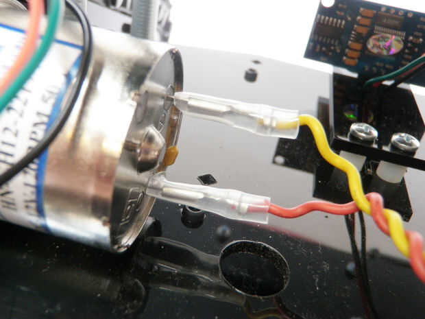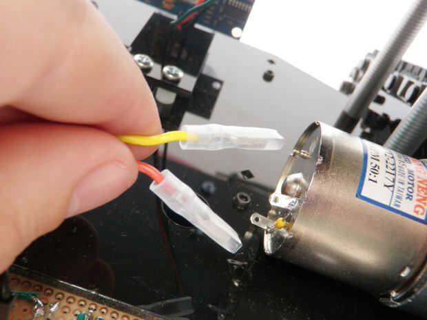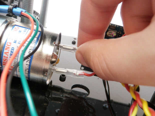 Conecte el conector del motor cables de los motores deslizándolos en los terminales del motor tal que ambos cables amarillos van a la terminal más y ambos alambres verdes van a tierra.