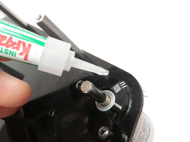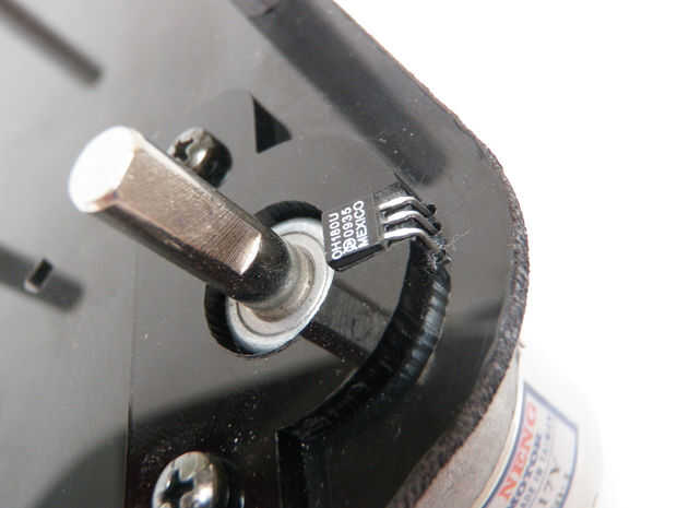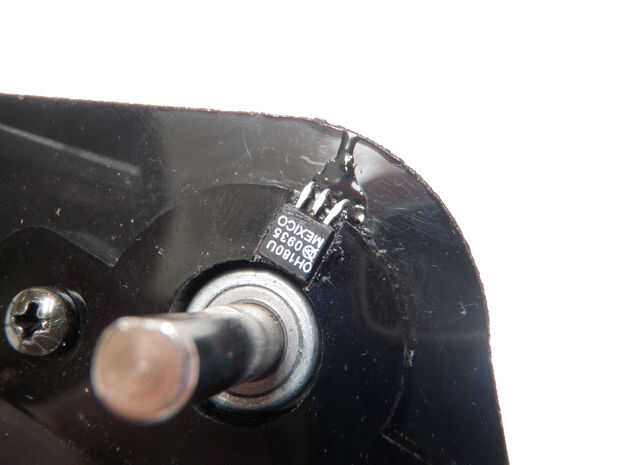 Curva del sensor de efecto hall conduce a un ángulo recto (de texto). Conecte los cables de sensor de efecto hall a través de los tres orificios que usted simplemente perforado y coloque firmemente en su lugar. Cuando has conseguido llegar al ras con la superficie del acrílico sensor soporte, pegue el sensor en su lugar.