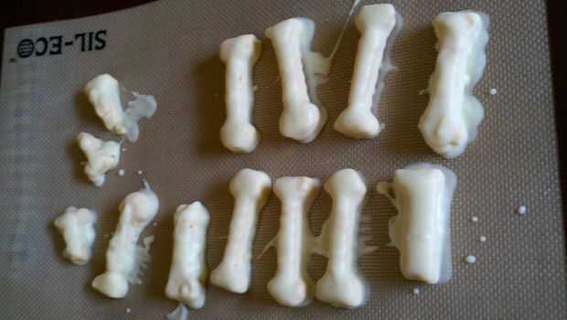 Destroce el chocolate durante 30 segundos en poder.5 blanco, seguir haciendo esto hasta que empieza a brillante y se puede revolver alrededor. Añadí el aceite de coco, que lo hizo fácil a dip, pero por desgracia se funde muy fácil. Creo que terminé haciendo concha mágica. Si alguien tiene alguna sugerencia de como hacer el chocolate más difícil (sospecho que necesitaba más chocolate) lo agradecería mucho. Sumergir las piezas en uno por uno y utilice un tenedor para pescado hacia fuera y sobre el silpat limpio. Luego pégalos en el congelador. Utilice un cuchillo afilado para recortar cualquier bits torcidas.