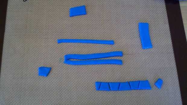 Utilicé un cortador de pizza para cortar tiras de azul para la decoración, Nota sobre la parte curva azul en la parte superior de la cabeza era capaz de hacer muchas por corte en ángulos opuestos y luego los bancos las formas.
