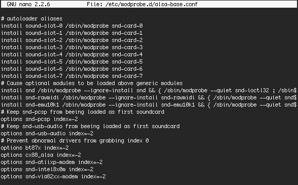 Ahora vamos a editar la línea donde dice índice de opciones snd-usb-audio = -2, esta línea no permite el dispositivo de audio USB como el dispositivo predeterminado se utiliza, poner un # delante para borrar la línea y son así: