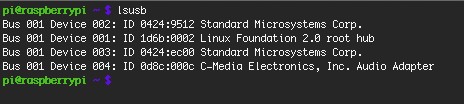 Primero empezamos con la frambuesa Pi tarjeta de sonido conectada a un puerto USB. Al final del sistema operativo arranque introducimos este comando en la consola para todos los dispositivos USB conectados: