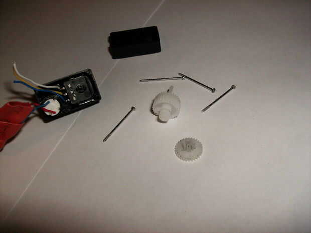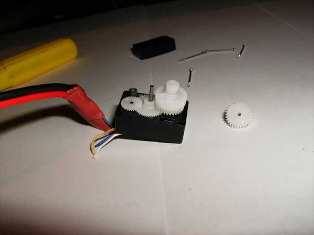 3. trata de encajar los engranajes excepto uno. Pegué el gran engranaje al que debajo de ella para ser alta enogh "salir" del caso. No es exactamente una regla de cómo hacerlo... varios servos tendrá varias Artes por lo que tendrá que probar hasta que encuentre la mejor "combinación".