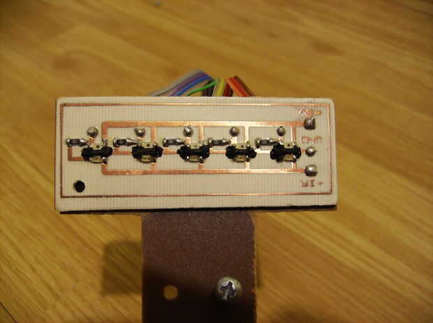 Hice mis sensores que utilizan diodos de emisión de 5 SMD IR, fototransistores SMD 5 y 5 1 resistencias SMD de k. Entre el fototransistor y el IR pongo algunos silicona negra para que la luz IR no vendría directamente al fototransistor. El diseño de la PCB está en el archivo "línea follower.rar". Está hecho en PROTEUS, pero tengo un documento de word incluyendo todos los diseños de PCB que pueden ser impresas en papel brillante o prensa y cáscara y luego se transfiere a la placa utilizando el método de la plancha.