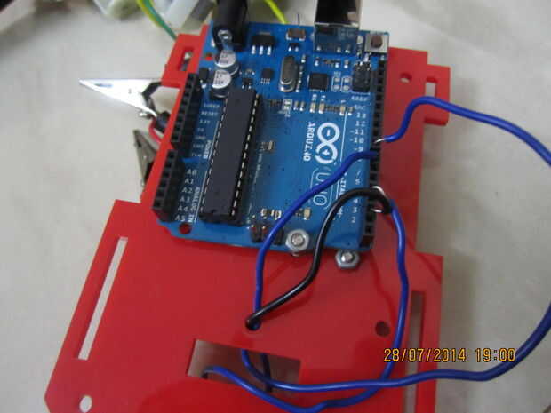 evitando el obstáculo el robot es un robot sencillo que es funcionado por un arduino y lo que hace es que sólo deambula alrededor y evita obstáculos. Detecta los obstáculos con un sensor de ultrasonidos HC-SR04 en otras palabras si el robot detecta o