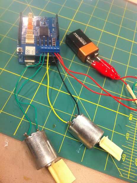 Recuerde que cuando utilice el protector de motor en el futuro medidas que los motores toman análogo de 0 y 1 analógica para el envío de información hacia el escudo del motor, por lo que no podemos utilizarlos. La dirección de los motores también depende de cómo cada uno de los cables de canal están conectados al motor. Si un motor está girando en la dirección equivocada, o bien cambiar la dirección en el código cambiando el Digital salida 13 o 12 para canales A y B, respectivamente. O se puede cambiar cómo se unen los cables de canal a los separadores motor, invirtiendo el sentido de la corriente y la dirección de los motores.