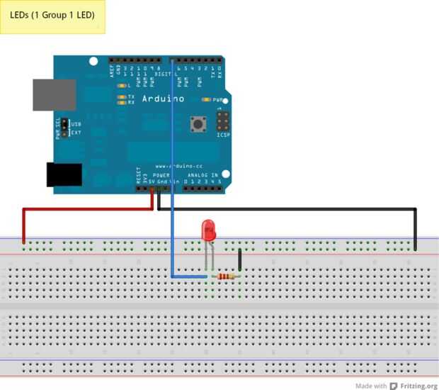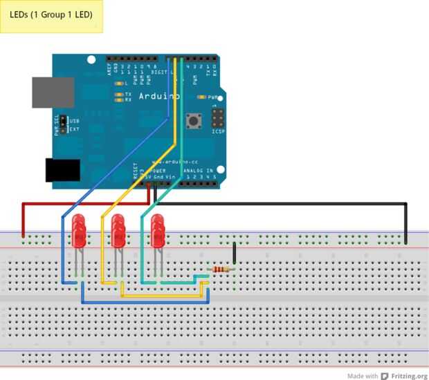 La serpiente contiene tres grupos de LEDs, cada una con 6-7 luces en cada filamento. Para crear grupos de LEDs, es el mismo proceso que crear un solo grupo con un único LED en él. En nuestra serpiente utilizamos Pin 5 Pin 6 y Pin 7 para controlar los diferentes filamentos de los LEDs. También para ahorrar espacio en nuestra protoboard, conectamos cada grupo de LED a la resistencia misma que conecta a tierra.