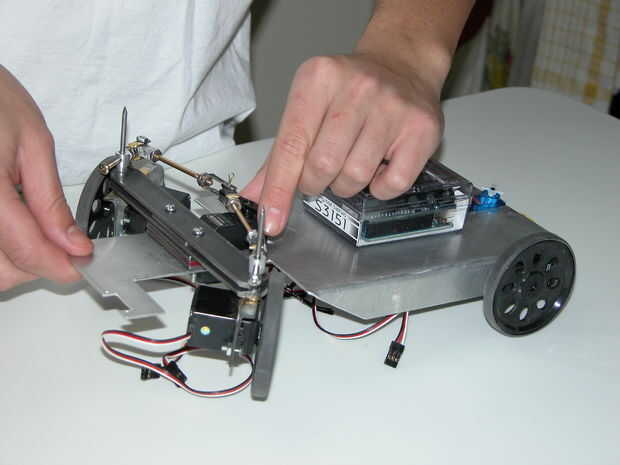 Empezar por crear el marco que se hace de un trozo de metal de hoja. Utilizar los planos adjuntos para marcar las dimensiones y cortes en el metal y luego cortar la forma básica del robot. Comience usando una tabla pura del metal de hoja para cortar las dimensiones ásperas y crear un borde limpio para trabajar con. A continuación, utilizar sierras y otras herramientas de corte de metales o su elección (yo usé una sierra caladora eléctrica de mano) para cortar los espacios para la parte delantera y trasera conjuntos rueda/servo. Asegúrese de archivo/grind los filos después del corte como medida de seguridad. Utilice la herramienta Dremel (o equivalente) con un corte o talla poco hueco espacios para los servos. Dar un poco de espacio extra alrededor de los servos para asegurarse de que no se usan contra el metal y pueden ser instalados fácilmente. Discos de corte rotatorio de Dremel son útiles al hacer esquinas de 90 grados que los servos en. Utilice la herramienta Dremel para cortar los recortes de servo mini en la parte delantera del robot. Tenga cuidado cuando use los discos de corte para mantener las manos lejos del metal que es cortado y preferiblemente usar guantes porque el metal se calentará muy. Tomarse un descanso y permitir que el metal se enfríe. He tenido problemas con la "fusión" / construcción en el disco de corte que impidieron que corte y en su lugar creó una gran cantidad de calor de aluminio. Usé un archivo para eliminar este incrustaciones de metal en el disco de corte. Utilizar una combinación de la herramienta Dremel y un taladro para perforar los orificios para los servos. Los orificios de montaje de los servos deben ser marcados por la medida y ojo debido a las imperfecciones que pueden cambiar las ubicaciones de montaje de los planos originales. Asimismo, los tamaños de la tuerca y el perno deben ser comprados por servo. Dejar el doblez de la llave de 90 grados apagado hasta después de todos los recortes de marco se han realizado desde flexión antes de tiempo hará que el marco difícil de manejar y por lo tanto trabajar en.