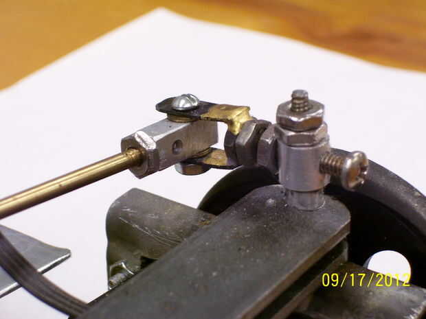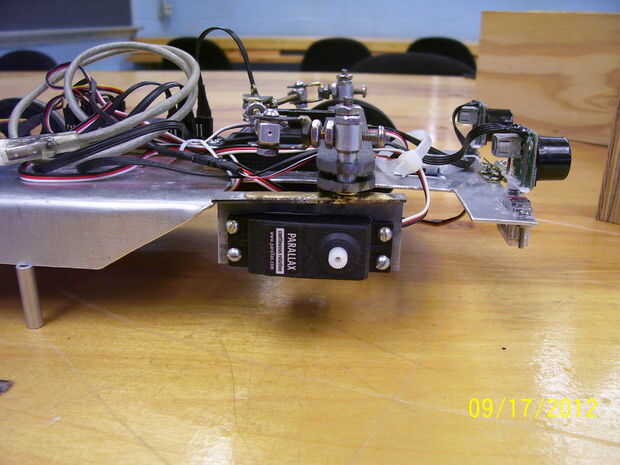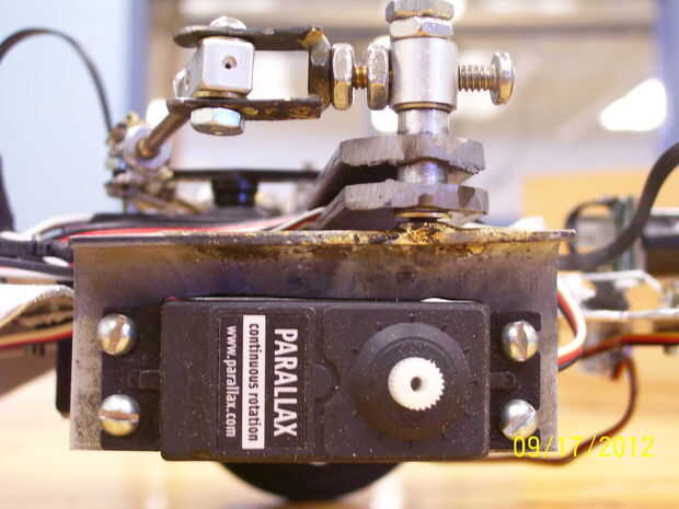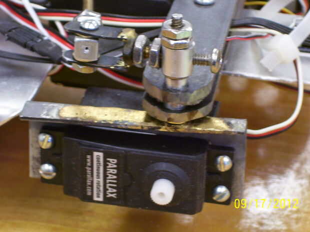 El soporte del servo están hechos de una pieza de metal que se doblará en la parte superior y provee una pequeña área plano donde un clavo puede ser unido por soldadura fuerte, soldadura o soldadura de plata según el metal utilizado. He utilizado una placa de acero soldada a un clavo de acero común.