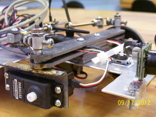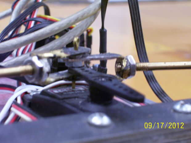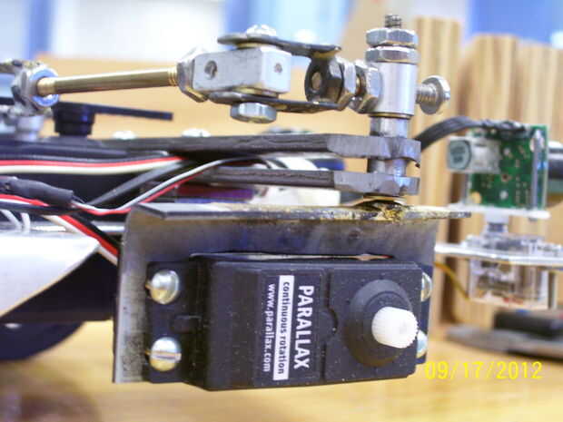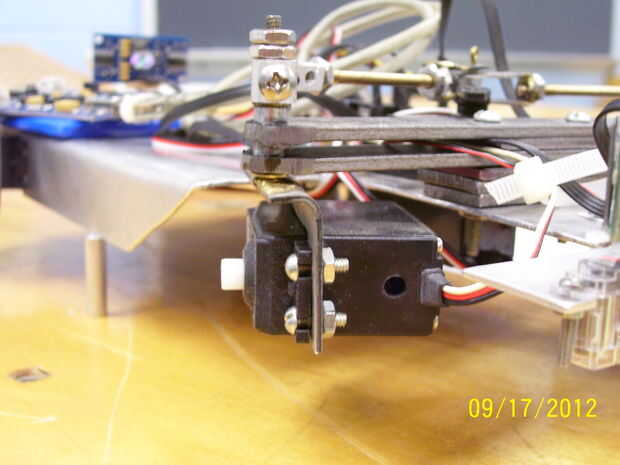 Haga clic en imágenes para notas. Después, conecte los dos vínculos al servo con algunos espaciadores y una chaveta. Experimento con la otra sostiene en el brazo del servo para determinar que funciona mejor para usted.