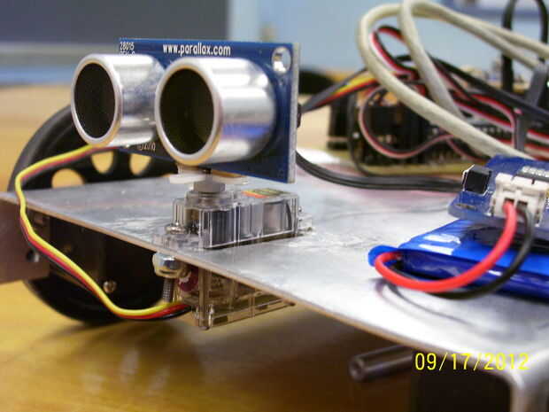 Para el sensor trasero, utiliza un sensor Ping de Parallax. Por defecto, los pines están en 90 grados a la Junta. Quite estos pernos o doblar hacia fuera recto cuidadosamente sin dañar el PCB. Quité los pernos y reemplazándolas con pines estándar, recto. Si decides eliminarlos, asegúrese de que no dañar los rastros de circuito por recalentamiento o forzar con un soldador. Utilice una herramienta de eliminación de soldadura o retire la soldadura con un cepillo de alambre. Pegar un pequeño trozo de madera en una bocina de 4 servo armados asegurándose de dejar el orificio del tornillo expuesto para acceder. Montar una cabecera de pin hembra además que puede conectarse el sensor Ping.
