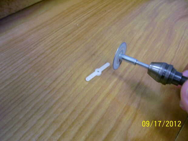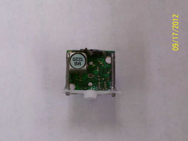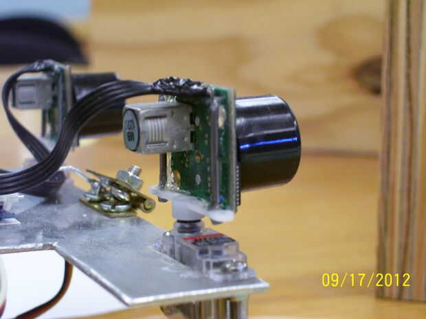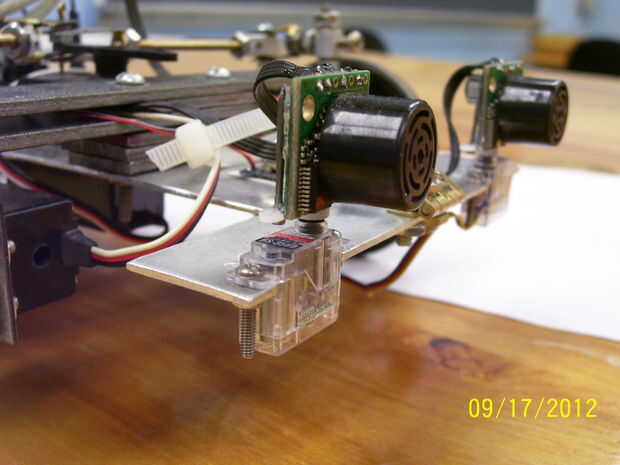 Montar los sensores hacia adelantados en los brazos de servo cortando una muesca pequeña en la par circular del brazo servo que va alrededor de la spline (ver fotos). Uso un cuerno del servo que tiene dos brazos y es plana a través de todo el camino (no crecen en el medio). Ampliar dos de los agujeros en el brazo del servo que se utilizará para colocar clavos que apoyan el sensor. Los clavos del clavito pequeño ir verticalmente a través del brazo del servo y suben hasta la parte superior del sensor. Coloque el sensor en la ranura de corte en el brazo del servo para que la placa de circuito de sensores es paralela a los clavos del clavito. Pegamento el sensor con un pegamento adecuado y asegúrese de que el sensor se enfrentará a horizontal si no ligeramente hacia arriba una vez instalado.