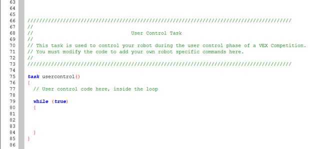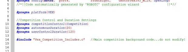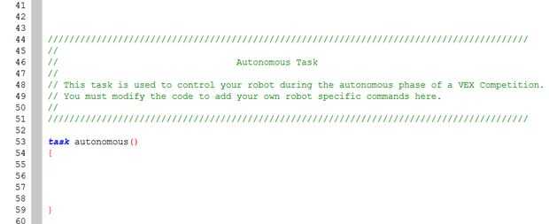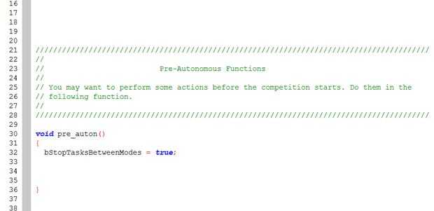 Esta sección de la plantilla de la competencia, es donde pones tu disco controlado por programa, para el inicio de cada partido, también conocido como el "autónomo". En este código, todo lo que desea que el robot no debe ser controlado por su programa, como tratando de implementar un programa de impulsión no trabajo en la sección Autónoma de la competencia.
