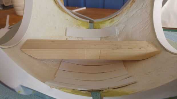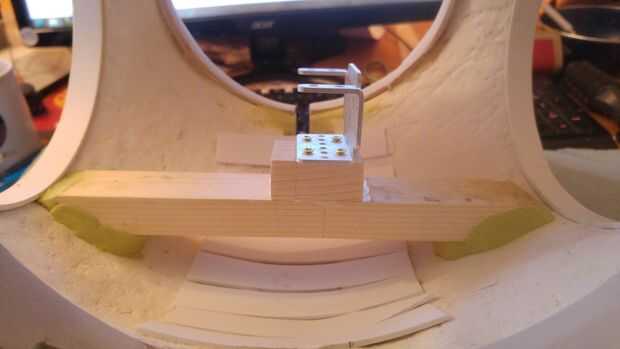 El siguiente paso fue crear una plataforma para la torre de servo para sentarse, corté algo de madera a medida por lo que encajaría en la sección de centro, usé milliput entre la madera y el forro interior para lograr un ajuste perfecto y crear una superficie mejor pega. Entonces pegué otro pedazo de madera exactamente en el centro encima de esto. Luego até un soporte del servo a la parte superior de este. Quería pintar el interior negro, sin embargo la superficie era bastante áspera así que cubrí el interior con papel maché (periódico tiras esta vez) ya que esto añade más fuerza y también crea una superficie lisa.