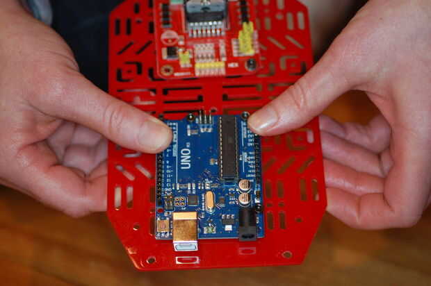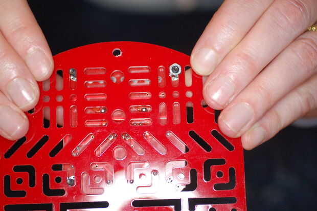 4. Coloque cada tarjeta electrónica con 3 tornillos y tuercas. Asegúrese de que no son demasiado apretados, que doblará los tableros de circuito o la cubierta del robot.
