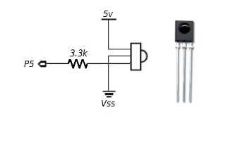 - Conectar la clavija de la izquierda a un resistor de k 3.3, luego a P5