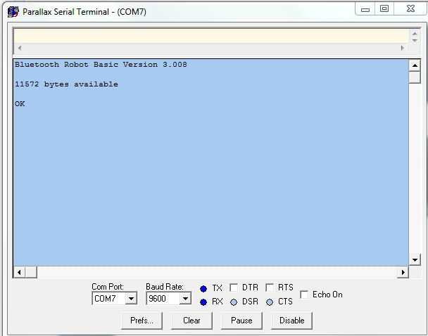 Descargar este archivo y enviar "Bluetooth Robot Basic.spin" a tu robot con F11 en la herramienta de la hélice.