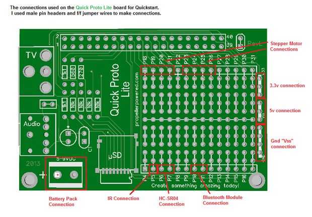 La parte importante es ese poder el inicio rápido, proporcionando energía para el resto de la robusteza y tener acceso a una porción de i/os de la hélice. (En mis ejemplos, va a utilizar el tablero "Rápida Proto Lite" que viene con el inicio rápido de Propellerpowered. Ver tercera imagen para los puntos de conexión.) Desde aquí, te especifico las tensiones y esquemas en general términos que usted tendrá éxito sin importar qué configuración de tablero de hélice use.