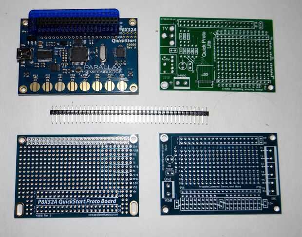 El tablero verde a la derecha del inicio rápido es la "Rápida Proto Lite". Tiene conexiones para TV y Audio que probablemente no utilizarás para un robot, pero también tiene la capacidad de tu inicio rápido de la energía y tener una toma microSD añadida. (En el momento de la redacción de este documento, la junta rápida Proto Lite se ofrece gratis con la compra de un inicio rápido de Propellerpowered.com lo que es un buen negocio.) P8X32A Inicio rápido PCB fotografiado directamente abajo el Quickstart es también una opción económica que cuesta sólo $4,99 de Propellerpowered y paralaje que requieren en un encabezado de 40pin macho (fotografiado) para adaptarse a la rápida) Finalmente, en la parte inferior derecha es el Propellerpowered "Servo & More" del tablero que se también se puede configurar para el inicio rápido con mucha área de prototipado para tu robot.