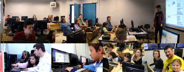 Como parte de la informática en la iniciativa de la escuela (http://www.computacaonaescola.ufsc.br), realizamos talleres de la familia como parte de los programas escolares o de forma independiente (ver la última de las imágenes de arriba). Los talleres están dirigidos a niños (6-14 años) acompañados de un padre (o cualquier tipo de miembro adulto de la familia o amigo). Durante el taller los participantes aprenden cómo implementar un pequeño proyecto en Scratch. Nos elegir proyectos donde aprender a programar consiste en simples movimientos y miradas de comandos así como eventos, condicionales y bucles utilizando operadores y comandos también sensado. Mientras que enseñanza al programa, también presentamos conceptos básicos de informáticos como la comprensión de algoritmos para resolver problemas (planteamiento del problema, implementación y ciclo de pruebas), colaboración en forma de programación par así como el entendimiento de que un programa de computadora es un conjunto de instrucciones paso a paso para actuar hacia fuera.