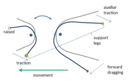 El gráfico arriba ilustra el principio de movimiento de cuatro-legged caminantes con dos conjuntos de pierna rígida. No parece ser una solución muy intuitiva, pero, de hecho, es un mecanismo muy simple. No es necesariamente el más eficiente, desde algunos pierna arrastrando ocurrirá, pero que funciona sorprendentemente bien por su sencillez. La idea es que, cuando está en movimiento, el robot tiene siempre tres patas en el suelo y uno levantó. La pareja de tierra tocando la pierna frontal/trasero contralateral dará tracción en la dirección deseada, mientras que la tercera pata tocar tierra será arrastrada a lo largo, realizando un movimiento en contra de la dirección de movimiento del robot. Puesto que el peso del robot debe ser distribuido principalmente en las dos piernas de tracción, la resistencia no será tanto como para impedir el movimiento hacia adelante.