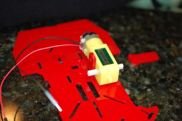2. Coloque el eje motor (árbol brillante, metal en la foto) en la parte trasera del chasis (borde recto es la parte de atrás).