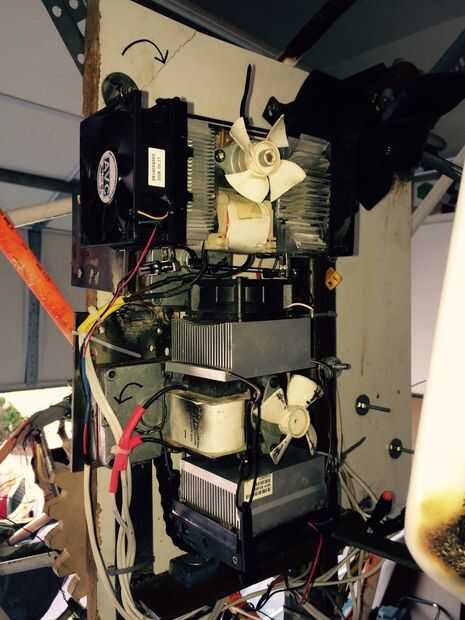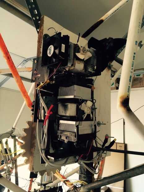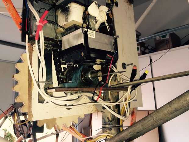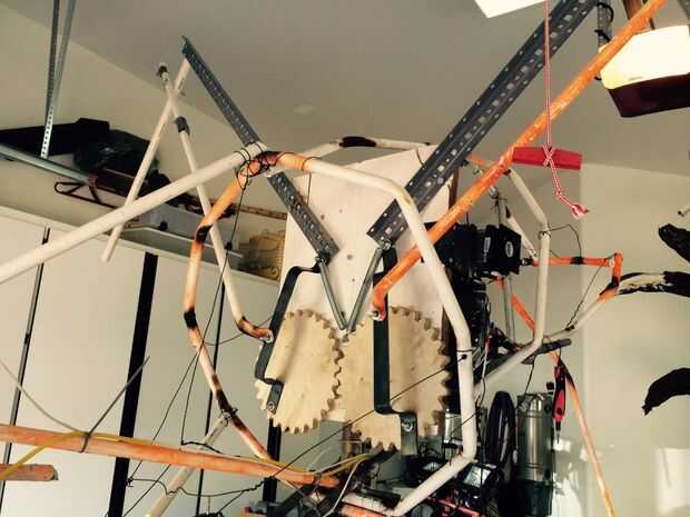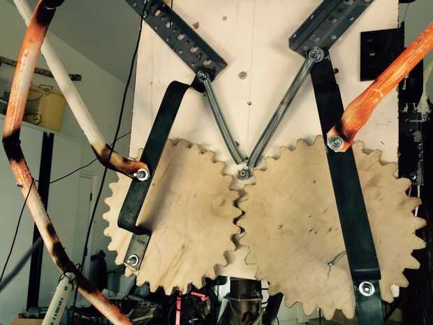 4. alas de doble articulación: esta parte era probablemente lo más divertido para crear. Quería movimiento de la vida real en lugar de solo un único conjunto de ala. Usé la aplicación de fuerza efecto movimiento de Autodesk para el diseño de las alas. Era realmente col para aprender a utilizar. Así que hice un plan rápido sobre cómo iba a hacerlo. En su mayoría estaba formado en las cosas que tenía que poner alrededor de mi casa. Utilicé una pieza de contrachapado como la principal para apoyar los motores, cadenas y mecanismos de ala. Las alas ellos mismos fueron hechas del PVC y del metal como la espina dorsal superior principal. Empecé ordenando dos rodamientos de lazy susan de Amazon. Entonces creé engranajes de madera de contrachapado con un engranaje con un eje conectado que le sobresalen sobre un pie. Los engranajes de madera entonces fueron empernados al perezoso susans con entonces fueron empernados a la parte posterior de la madera contrachapada principal. Todo este mecanismo es difícil de describir tan mirada en mis fotos ojala las describirá lo mejor. Para que las alas para moverse, usé dos poco 120v AC motores configurar en línea con uno a través de una cadena de servicio pesado. Así que tuve que poner dos disipadores de calor y dos ventiladores por motor para mantenerlos frescos, estos motores calientan extremadamente. Estos motores fueron Unidos a los piñones que condujeron a una cadena, la cadena fue unida a una rueda dentada se reunió en el eje de engranaje que se hizo anteriormente. Luego añadí un cojinete resistente para apoyar la alineación del eje. Revisa mis fotos para una explicación más detallada. Las alas se trasladó a aproximadamente 6 RPM