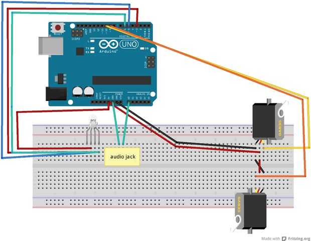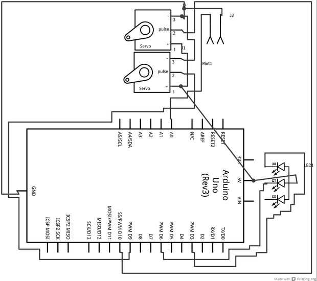 Inicio siguiendo el diseño esquemático o protoboard a un pcb o protoboard. Una vez que termines con el cableado que tienes que pensar en donde vas a poner tu arduino y el circuito. En mi robot tenía la caja del motor (siguiente paso discutido) en la parte superior una caja más grande con todos los componentes y arduino. Pongo mi multicolor en la nariz de mi muñeca.