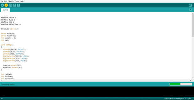 Las últimas cosas que hacer es cargar el código. Basado en el número de servos que tienes u otras especificaciones a su proyecto, que usted probablemente tendrá que jugar con el código.