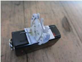 Ahora pegar, con pegamento, la base (rectángulo imprimirse antes) en la parte inferior de la placa del centro. Pegar la placa de centro sobre la línea 2 en la final. Otra vez usando pegamento Fije su engranaje en el eje directamente en el otro lado de la placa de centro de los mecanismos de la pierna. Yo he subrayado la colocación correcta con un círculo. dejar secar.