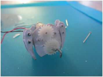 ahora para la parte más incómoda, necesita llevar su motor con la impulsión del gusano pegada en su eje y el motor con pegamento a prueba de calor del palillo verticalmente para que su engranaje de gusano es que se enclavija perfectamente con tu diente que usted previamente pegados en el eje.