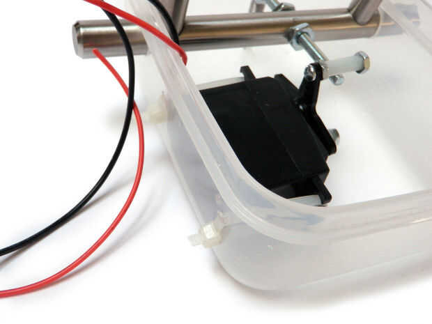 Las varillas que sobresalen de la horn de servo ahora se deben entrar en contacto con el perno insertado a través de la tira del cajón.