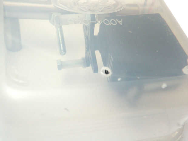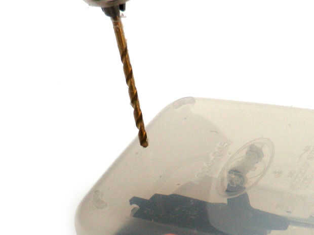 Perfore un agujero de 1/8" en un lugar en el envase de plástico donde usted puede pasar a través de los cables de alimentación de los servos sin interferir con el funcionamiento del motor.