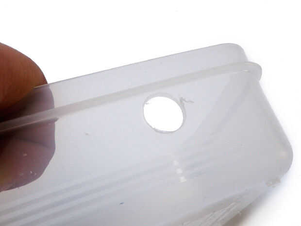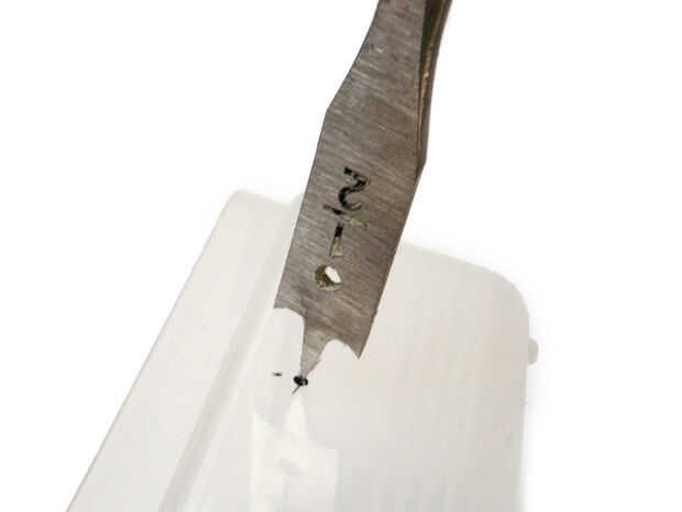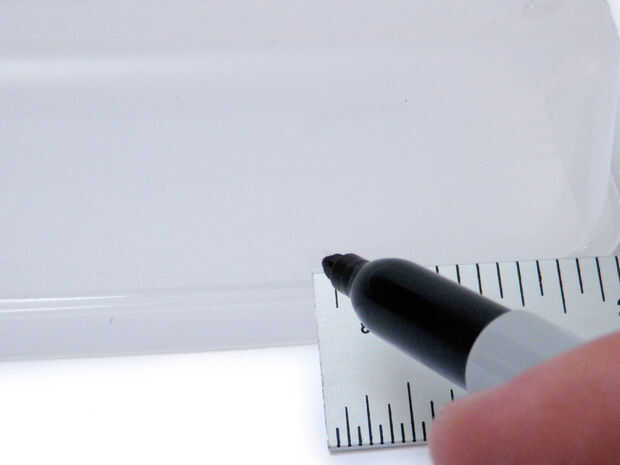 Invierta el envase de plástico. Mida 1/4" desde el contenedor del labio y 2" en el lado del contenedor. Haga una marca.