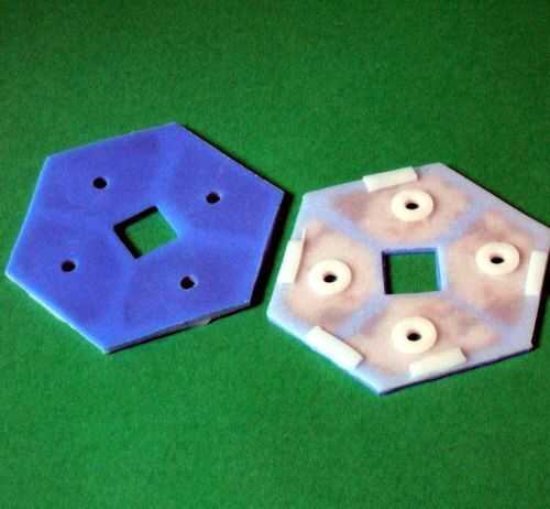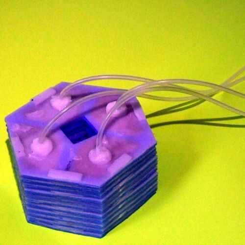 La segunda foto muestra inferior, superior y músculo dos segmentos. Los segmentos se convierten en dos capas con una fina lámina de polietileno, creando una cámara de aire que puede ser llenada con aire. Un agujero en el centro de cada cámara muscular trae el aire a la cámara cuando todos los segmentos se apilan y se pegan.